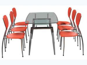 Bàn ăn khung thép mạ, mặt bàn sử dụng kính cường lực và có thêm ngăn nhỏ ở dưới.