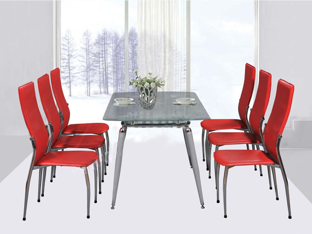 Bàn ăn khung thép mạ, mặt bàn và ngăn bàn bằng kính.Chân bàn làm bằng ống thép tóp.
