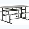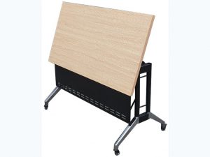 Bàn hội trường khung thép sơn tĩnh điệnmàu đen kết hợp mạ, mặt gỗ Melamine. Mặt bàn có thể gấp gọn giúp tiết kiệm không gian sau khi sử dụng. Chân có bánh xe di động có khóa hãm và mặt bàn sử dụng gỗ công nghiệp có độ dày 18mm.