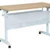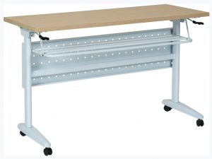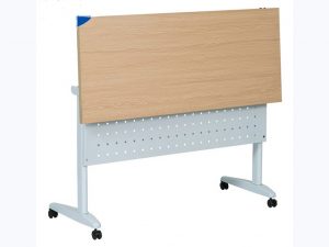 Bàn hội trường khung thép sơn tĩnh điện, mặt gỗ Melamine. Mặt bàn có thể gấp gọn giúp tiết kiệm không gian sau khi sử dụng. Chân có bánh xe di động và mặt bàn sử dụng gỗ công nghiệp có độ dày 18mm.