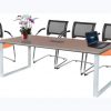 Bàn ghế phòng họp royal mặt bàn làm bằng gỗ công nghiệp melamine cao cấp, khung bàn và chân làm bằng ống thép tam giác sơn tĩnh điện tạo sự thẩm mỹ và chắc chắn cho sản phẩm. Bàn có 1 lắp ổ điện trên mặt bàn.