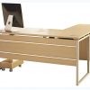 Bàn ghế trưởng phòng royal mặt bàn được làm bằng gỗ công nghiệp melamine cao cấp, chân sắt sơn tĩnh điện màu ghi, bàn có tủ phụ đi kèm, mặt bàn lượn chữ L. bàn có yếm tôn đột lỗ trang trí tạo nên sự thẩm mỹ cho sản phẩm.