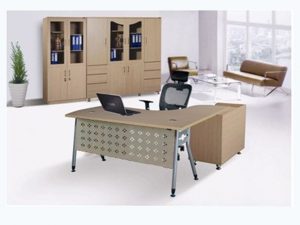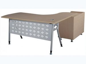 Bàn ghế trưởng phòng royal mặt bàn được làm bằng gỗ công nghiệp melamine cao cấp, chân sắt sơn tĩnh điện màu ghi, bàn có tủ phụ đi kèm, mặt bàn lượn chữ L. bàn có yếm tôn đột lỗ trang trí tạo nên sự thẩm mỹ cho sản phẩm.