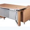 Bàn làm việc giám đốc royal được làm bằng gỗ công nghiệp melamine cao cấp, mặt bàn hình chữ nhật có ốp gỗ sơn trang trí ở phía dưới, bàn có tủ phụ chia làm 3 khoang, khoang bên phải để giá CPU, khoang bên trái có 2 tầng để tài liệu, khoang giữa có 2 cánh và 1 hộc liền bàn 2 ngăn kéo. bàn có yếm tôn có đột lỗ trang trí tạo nên sự thẩm mỹ cho sản phẩm.