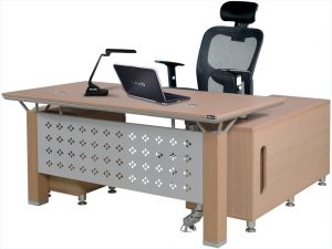 Bàn làm việc giám đốc royal được làm bằng gỗ công nghiệp melamine cao cấp, mặt bàn hình chữ nhật có ốp gỗ sơn trang trí ở phía dưới, bàn có tủ phụ chia làm 3 khoang, khoang bên phải để giá CPU, khoang bên trái có 2 tầng để tài liệu, khoang giữa có 2 cánh và 1 hộc liền bàn 2 ngăn kéo. bàn có yếm tôn có đột lỗ trang trí tạo nên sự thẩm mỹ cho sản phẩm.