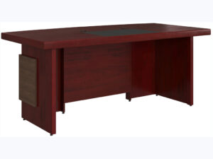 Bàn ghế trưởng phòng gỗ sơn PU được làm bằng gỗ công nghiệp sơn phủ PU cao cấp, mặt bàn lượn cong ghép hộp dày 60mm, không ngăn kéo, mặt bàn sơn đen giả bọc da PVC. Chân bàn được trang trí ốp gỗ nổi và nan mạ.