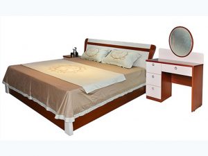 Bàn phấn cao cấp sử dụng chất liệu gỗ Melamine, Veneer và sơn Pu cao cấp kết hợp giữa hai tông màu gỗ và trắng, bàn có 4 ngăn kéo, gương tròn.
