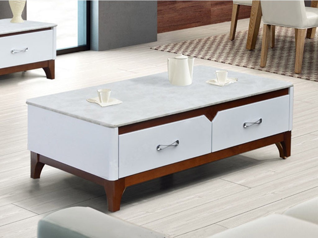 Bàn sofa khung gỗ tự nhiên kết hợp gỗ công nghiệp. Bàn có 04 ngăn kéo được chia đều 2 bên, sử dụng tay nắm mạ. Mặt bàn sử dụng chất liệu lõi đá tự nhiên được phủ vân nhân tạo.