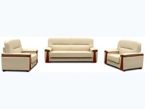 Bộ ghế sofa văn phòng được làm bằng khung gỗ, có ốp gỗ trang trí, ghế bọc da thật tại các vị trí tiếp xúc với người sử dụng. Gía bao gồm 01 ghế băng .