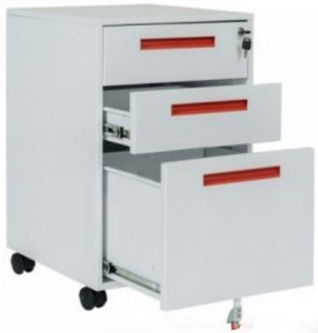 Hộc di động sắt sơn tĩnh điện đẹp được làm bằng sắt sơn tĩnh điện màu trắng sáng kết hợp tay nắm mà cam phù hợp với không gian văn phòng hiện đại, hộc có 3 ngăn kéo xử dụng cơ cấu ray bi, Hộc có bánh xe di chuyển. Phần mặt ngăn kéo và thành ngăn kéo vát góc, tạo thẩm mỹ và độ kín khít khi đóng ngăn kéo.