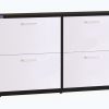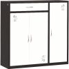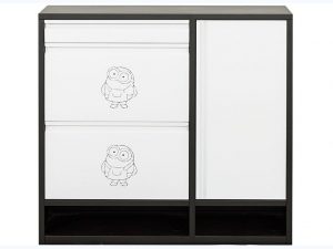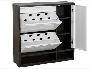 Tủ giày gia đình bằng thép sơn tĩnh điện màu cà phê, kết hợp cánh mầu trắng được cắt laser trang trí. Tủ được thiết kế nhiều khoang gồm: ngăn kéo để đồ phía trên, hai ngăn xoay phía dưới để giầy dép. Khoang bên phải cánh mở có các đợt để đồ và khoang dưới cùng để giày dép đi thường xuyên.