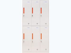 Tủ sắt hiện đại đựng đồ cá nhân được làm bằng sắt sơn tĩnh điện màu trắng kết hợp với tay nắm màu cam phù hợp với không gian văn phòng hiện đại. Tủ có 6 khoang sử dụng khóa locker mỗi khoang có 1 đợt cố định và 1 suốt treo quần áo.