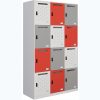 Tủ sắt locker đẹp được làm bằng sắt sơn tĩnh điện 9 khoang cánh mở. Trên mỗi cánh có 1 khóa số và 1 khe cất đồ nhanh phía trên. Tủ được trang trí và phối màu sắc hiện đại.
