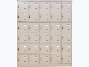 Tủ sắt locker nhiều ngăn được làm bằng sắt sơn tĩnh điện màu ghi. Tủ có 30 khoang cánh mở. Trên mỗi cánh có 1 khóa locker, núm tay nắm và tai móc khóa.
