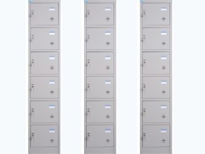 Tủ sắt locker nhiều ngăn được làm bằng sắt sơn tĩnh điện màu ghi. Tủ có 6 khoang cánh mở. Trên mỗi cánh có 1 khóa locker, núm tay nắm và tai móc khóa. Tủ sử dụng thép dày 0.5mm.