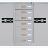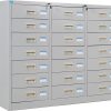 Tủ tài liệu sắt ghép được làm bằng sắt sơn tĩnh điện màu ghi. Tủ có 3 khoang, mỗi khoang có 4 ngăn kéo để file tài liệu sử dụng chung 1 khóa dàn.