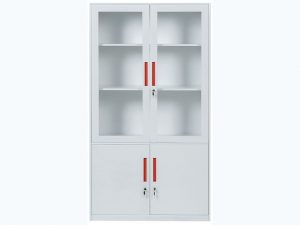 Tủ hồ sơ sắt hiện đại được làm bằng sắt sơn tĩnh điện màu trắng phù hợp với không gian văn phòng hiện đại. Tủ có khoang trên 2 cánh kính mở bên trong có 2 đợt di động chia làm 3 tầng để tài liệu, khoang dưới có 2 cánh sắt mở..