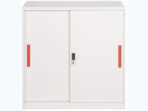 Tủ sắt hiện đại đựng đồ được làm bằng sắt sơn tĩnh điện màu trắng kết hợp với tay nắm màu cam phù hợp với không gian văn phòng hiện đại. Tủ có 2 cánh sắt lùa dùng khóa tủ lùa ngắn, bên trong có 2 đợt chia làm 3 tầng để file tài liệu.