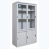 Tủ sắt đựng tài liệu (hồ sơ) cho nhân viên được làm bằng sắt sơn tĩnh điện màu ghi. Tủ có 2 khoang, khoang trên có 2 cánh kính lùa, bên trong có 2 đợt di động chia làm 3 tầng để file tài liệu, khoang dưới có 2 cánh sắt mở. Tủ sử dụng tôn dày 0.4-0.5mm.